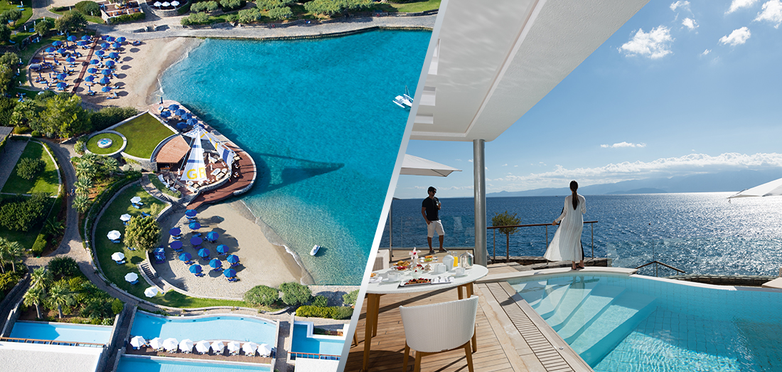 Панорама Elounda Bay Palace слева, одна из вилл Elounda Beach Hotel & Villas справа