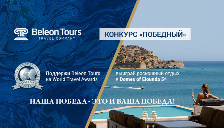 Конкурс «Победный» проводится на наших страницах в социальных сетях Facebook и Вконтакте. Для того чтобы стать его участником вам понадобится выделить 5-10 минут своего времени и… все! Эти минуты следует потратить на то, чтобы проголосовать на сайте премии World Travel Awards 2018 за Beleon Tours (номинации Greece’s Leading Travel Agency 2018 и Greece’s Leading Destination Management Company 2018) и Domes of Elounda (номинация Europe’s Leading Luxury Resort 2018), а также сделать репост конкурсной страницы на своей стене в одной из социальных сетей.