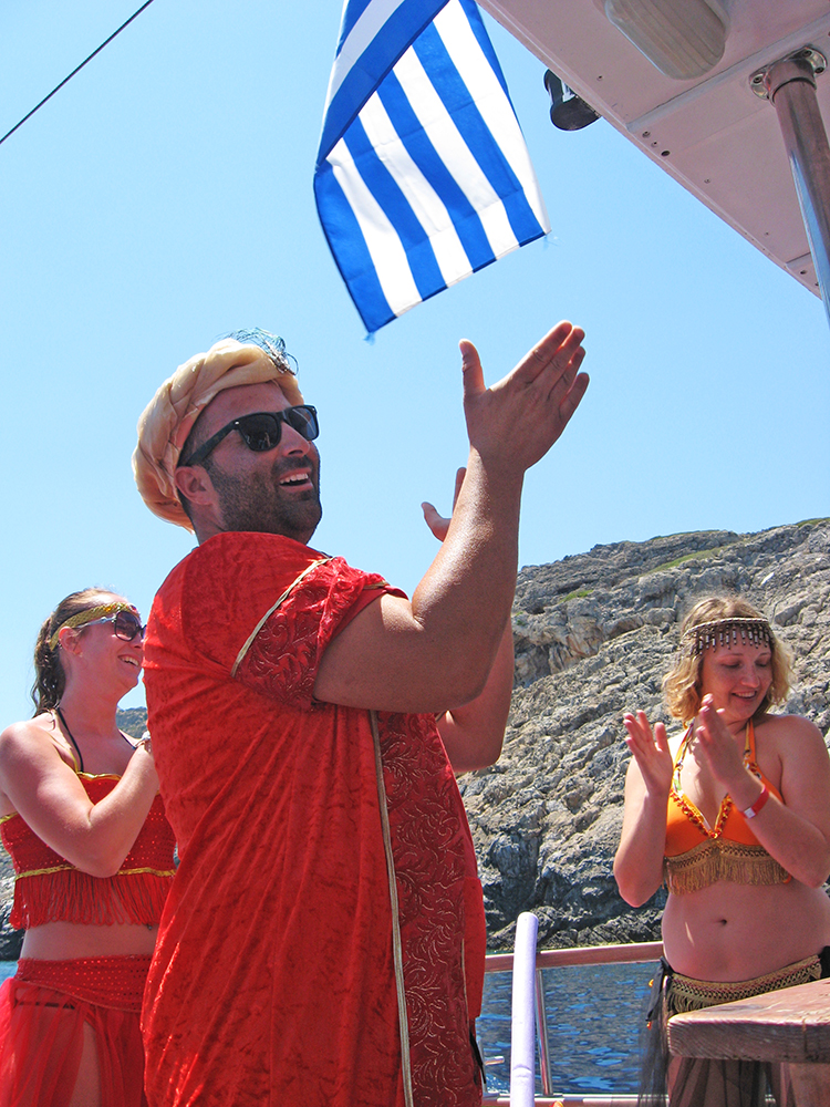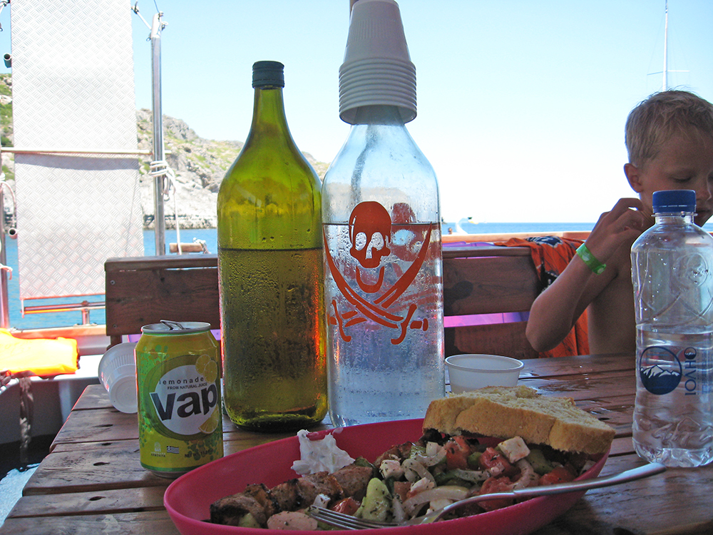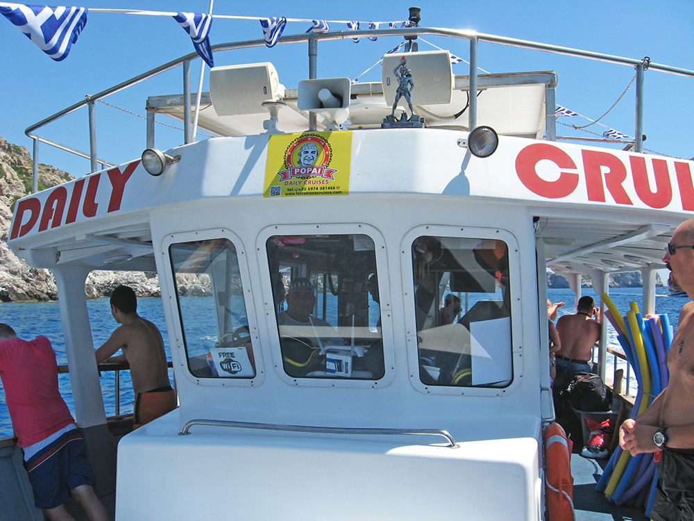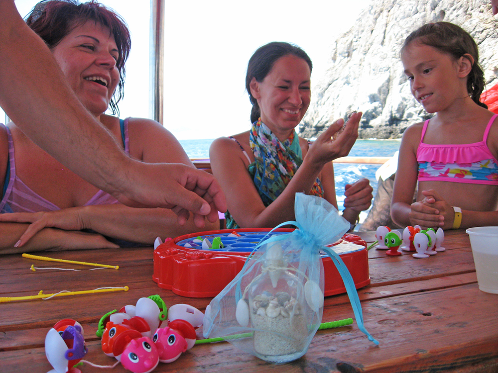 В этот раз снова отправилась на морскую прогулку. Это была моя 4-я поездка на Родос и 4-я прогулка. Три из них на «Попае». Замечательная команда кораблика (Анастасос и его семья) не только покажут самые красивые бухты восточного побережья Родоса, но и вкусно накормят и напоят. Даже те, кто поначалу как-то сторонились, немного погодя перезнакомились со всеми, весело общались, плавали, ели, танцевали на борту и даже играли. Смешно, но мы, взрослые люди, резались в настольную рыбалку еще эмоциональнее, чем дети. Гид Виктория развлекала всех. Конечно, для меня главное в этой прогулке – возможность поплавать в бухтах, зайти в пещеру на пляже в Трагану, полюбоваться островом с борта судна.